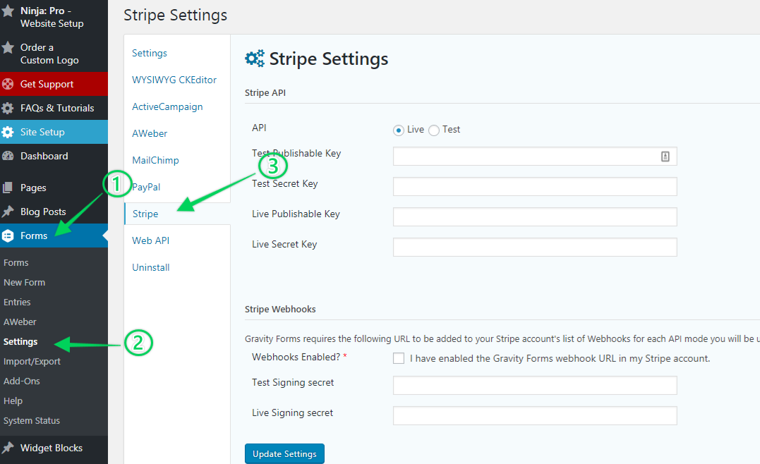 - Go to Forms > Settings > Stripe. You need to get your Stripe Tokens.